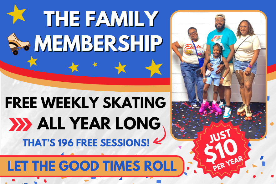 Skate FREE every week with a m embership that costs only $10 per person for the entire year. It’s the easiest & most affordable way to build a weekly family tradition. Show your pass at check-in and enjoy the fun!