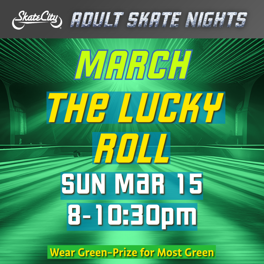Join us for our Lucky Roll night this March! The skater who wears the most GREEN wins a prize! Each month brings a new theme, great music, and a fun night out on wheels for adults 18 and up. Whether you’re repping your favorite team, dressing up in holiday gear, or rocking your best thrift store find, there’s something for everyone. Check back each month for what is ahead!