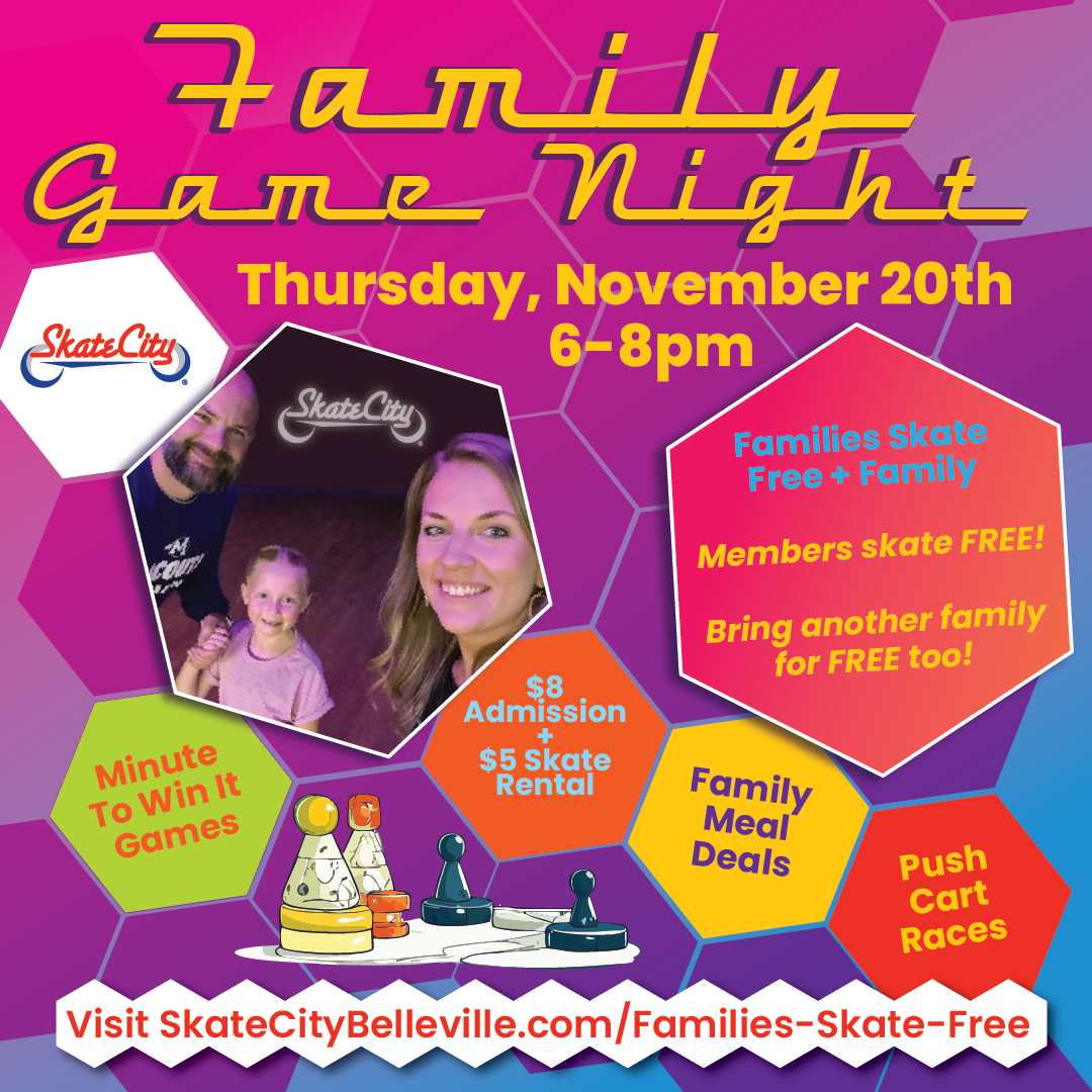 Join us for a special Family Game Night at Skate City Belleville on Thursday, November 20 from 6–8 PM! Enjoy a fun-filled evening with Minute-to-Win-It games, push cart races, family meal deals, and plenty of laughs on wheels. Families Skate Free members skate free and can bring another family for free, too. Admission is $8 per skater with $5 skate rental (if needed).