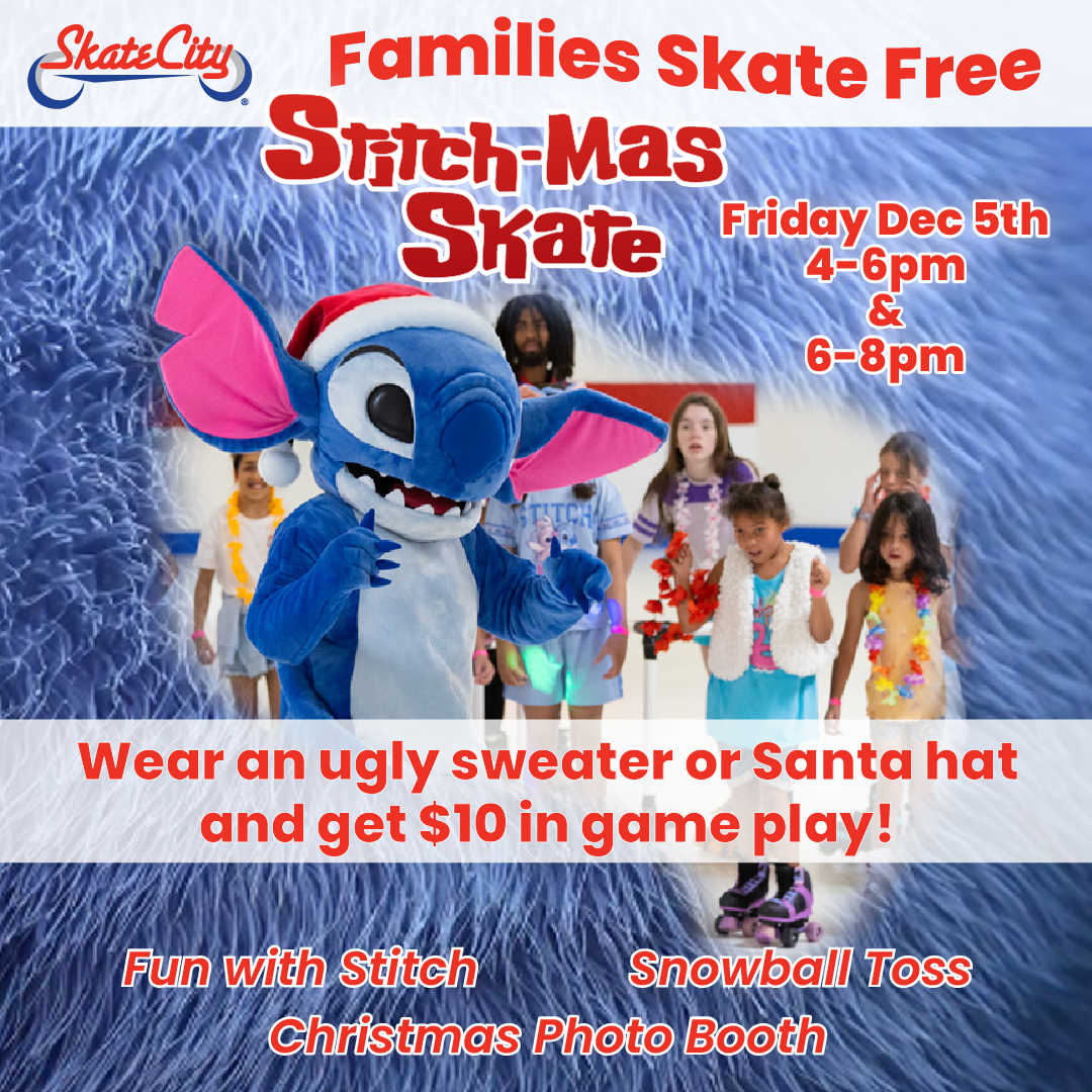 Join us for a festive Stitch-Mas Skate on Friday, December 5th with sessions from 4–6 PM and 6–8 PM! Families Skate Free members skate free, making it the perfect holiday outing for everyone. Wear an ugly sweater or a Santa hat and you’ll earn $10 in game play as a bonus. Enjoy holiday fun with Stitch, a Christmas photo booth, a snowball toss, and mroe! Admission is $8 per skater with $5 skate rental (if needed).