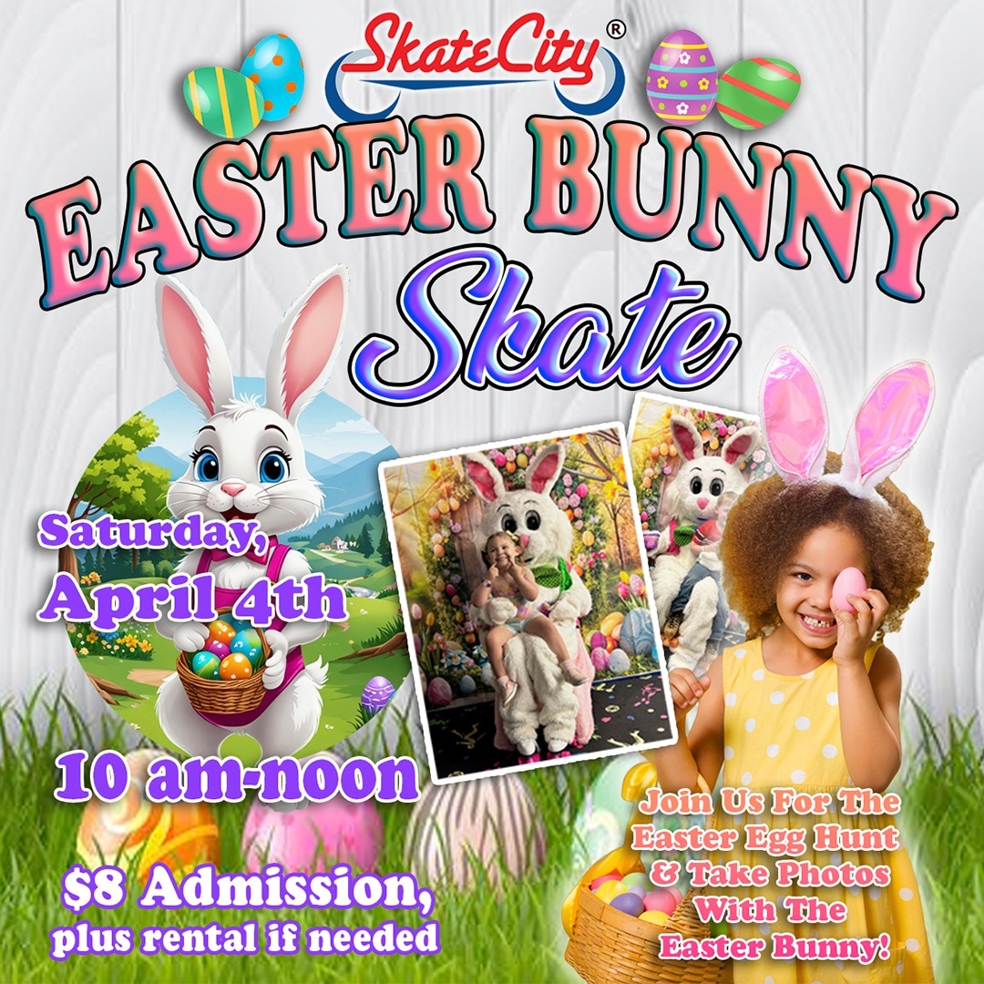 Hop into spring fun at Skate City during our Easter Bunny Skate on Saturday, April 4th from 10am–12 noon. Kids can skate, take photos with the Easter Bunny, and join in on a festive Easter Egg Hunt on the rink. It’s a cheerful morning filled with music, skating, and holiday excitement for the whole family. Admission is $8, with skate rental available if needed.