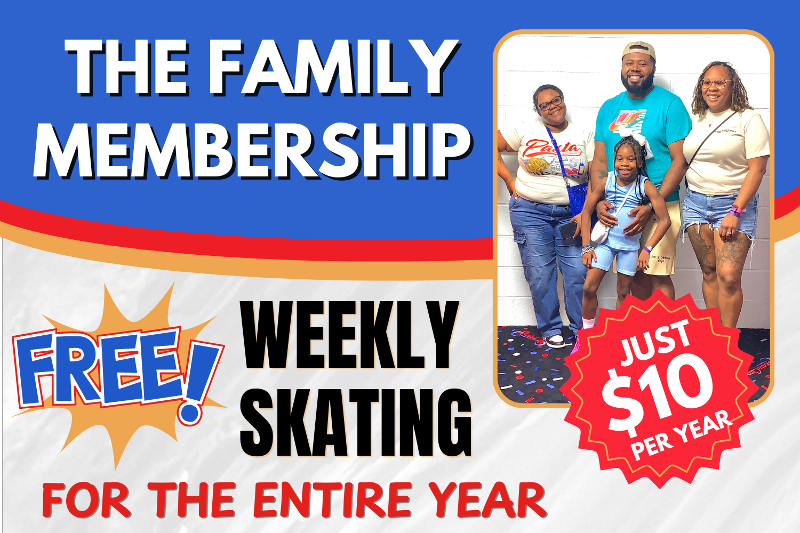 Affordable skating starts here! Join for just $10 per family member and enjoy FREE skating on Fridays, Saturdays, and Sundays, plus additional member perks.