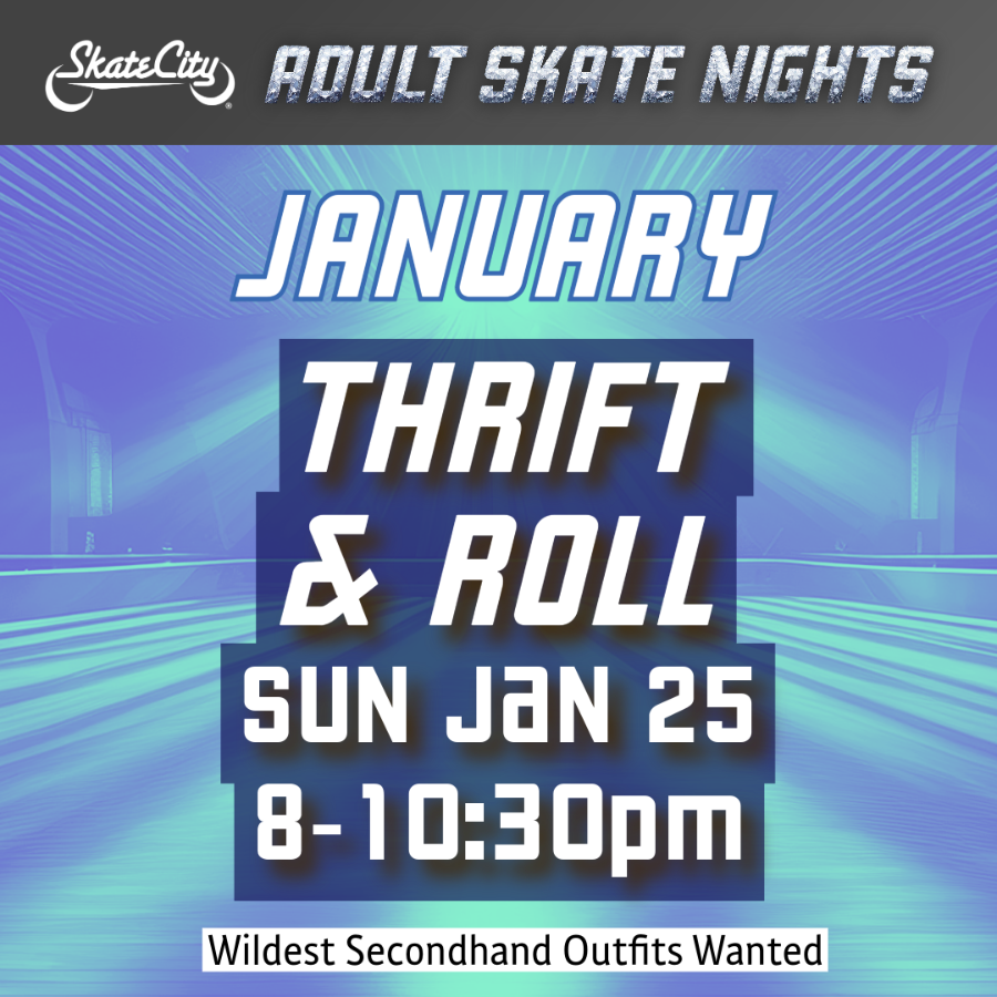 Join us on Sunday, January 25th for our Thrift and Roll party! Each month brings a new theme, great music, and a fun night out on wheels for adults 18 and up. Whether you’re repping your favorite team, dressing up in holiday gear, or rocking your best thrift store find, there’s something for everyone. Check back each month for what is ahead!