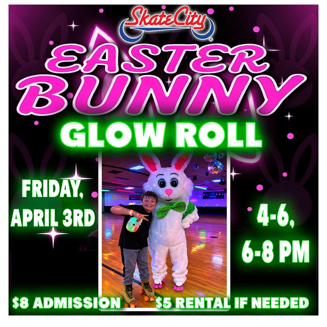 Get ready for a glowing night of Easter fun at Skate City during our Easter Bunny Glow Roll on Friday, April 3rd. Join us for two sessions from 4–6pm and 6–8pm and skate under the lights with the Easter Bunny. Kids can take part in a festive egg hunt and compete in our exciting Glow Egg Race on the rink. Admission is $8 with $5 skate rental available if needed, making it the perfect way to kick off your Easter weekend.