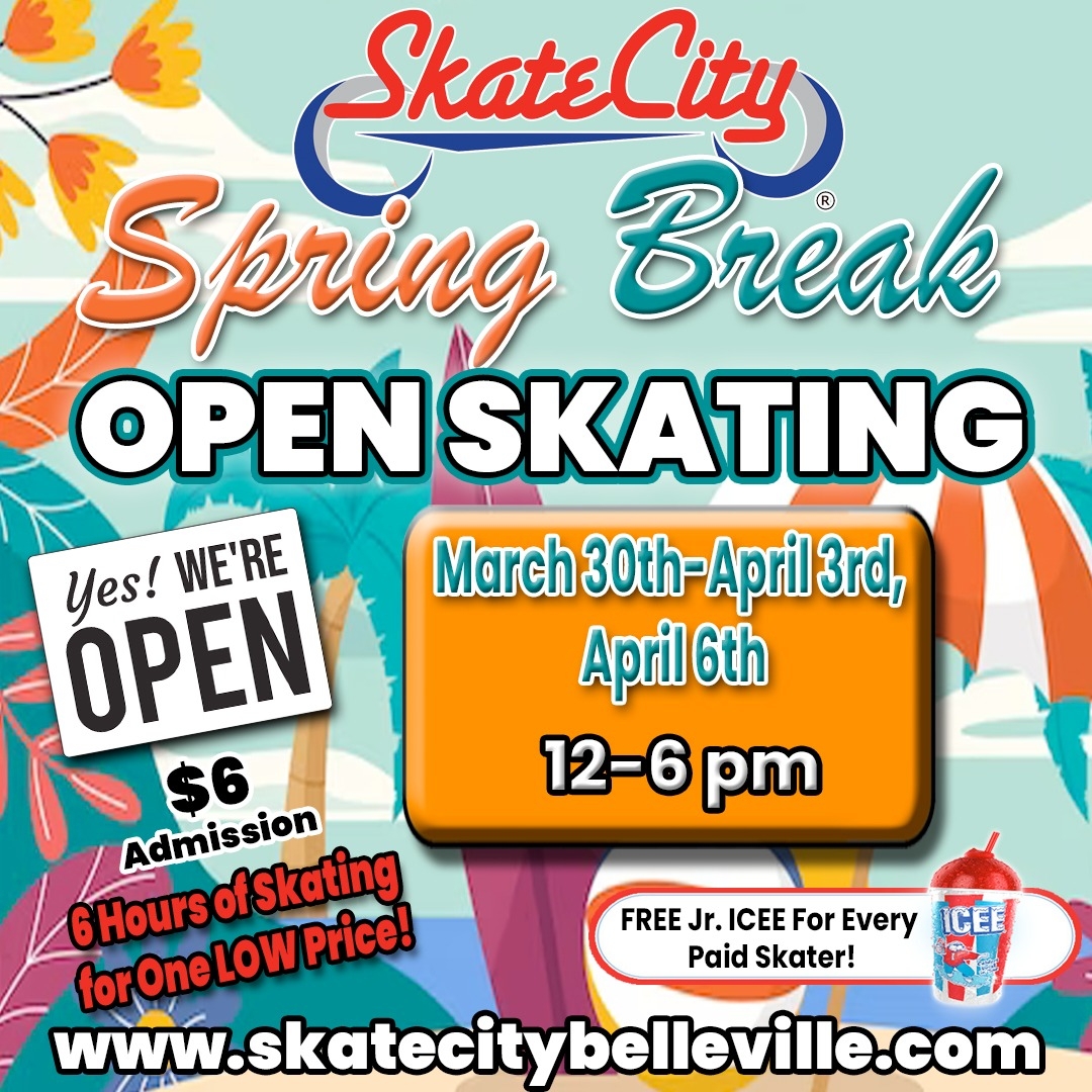 Spring Break is coming up, and Skate City Belleville is the place to be. Join us March 30th through April 3rd and April 6th from 12–6pm for Open Skating fun the whole family can enjoy. Admission is just $6 for up to six hours of skating for one low price. Plus, every paid skater gets a free Jr. ICEE! Start making your Spring Break plans now and get ready for an active, affordable week on wheels.