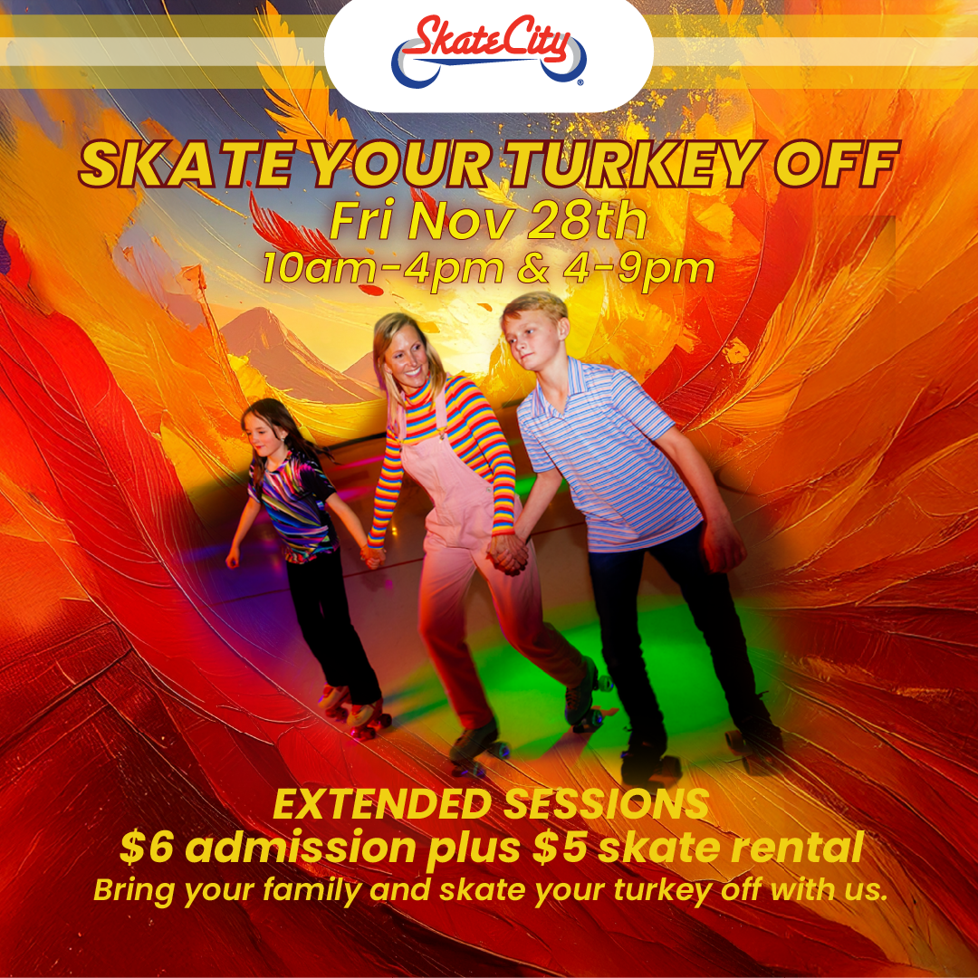 Burn off that Thanksgiving feast at Skate City’s “Skate Your Turkey Off” event on Friday, November 28th. Enjoy extended sessions from 10am–4pm and 4–9pm with $6 admission and $5 skate rental. Bring the whole family for a fun day of music, lights, and skating — the perfect way to keep the holiday weekend rolling.